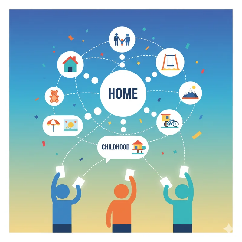 Players share personal memories and associations triggered by prompts like 'home,' 'childhood,' or 'vacation' to create meaningful connections.